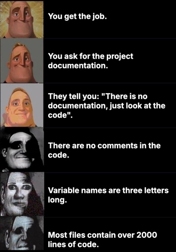 cm0002@suppo.fi to Programmer Humor@programming.dev · 15 hours agoThe Six Stages of Code Griefsuppo.fiimagemessage-square79linkfedilinkarrow-up1750arrow-down16