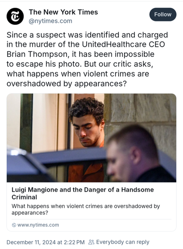 BonesOfTheMoon@lemmy.world to Antiwork@lemmy.ml · 1 year agoIs the New York Times fuckin' serious right now. (AKA another attempt to undermine Luigi's support).lemmy.worldimagemessage-square2linkfedilinkarrow-up11arrow-down10