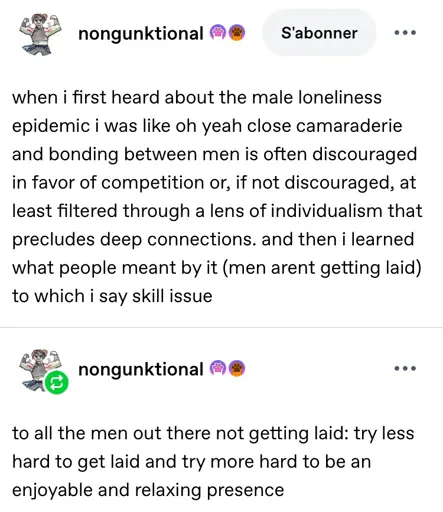 when i first heard about the male loneliness epidemic i was like oh yeah close camaraderie and bonding between men is often discouraged in favor of competition or, if not discouraged, at least filtered through a lens of individualism that precludes deep connections. and then i learned what people meant by it (men arent getting laid) to which i say skill issue