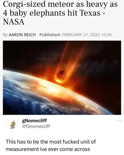 Uhm I mean God knows what they meant, but in this context I visualize this headline as a meteor with the VOLUME of a Corgi, definitely not a sphere with the diameter of the longest dimension of a Corgi, that doesn’t make much sense to me.