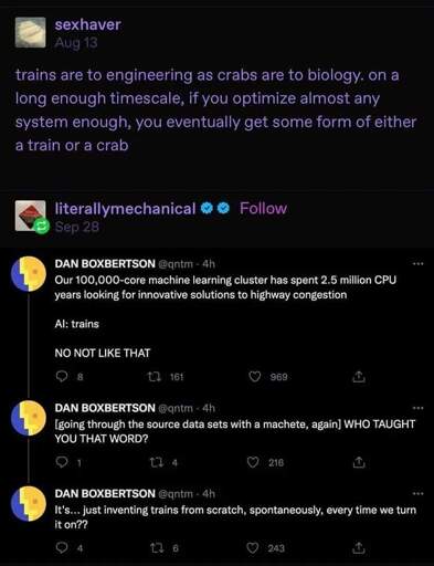 “we heavily biased the network against trains and now it’s just saying the optimal car consists of several metal struts connecting just two thinned out wheels that the driver sits on top of and propels themselves using pedals. It was busy redesigning intersections to have clear safe lanes for these bi-cycle ‘cars’ with plenty of trees / room for pedestrians when we pulled the plug…”