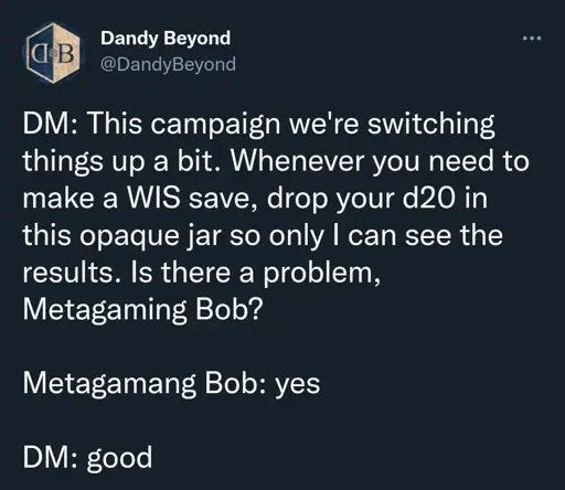 mothership has a cool mechanic where when you roll a death save, you do so under a cup so no-one can see it, then lift the cup when a party member goes over and checks to see if you’re alive