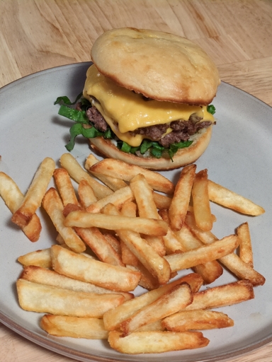 2 x 85g patties, smashed on a hot pan, with lettuce and chopped fresh onions on a freshly baked then buttered, and broiled bun with hand-cut fries.