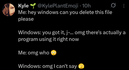 Yeah, back in my early pirate years as a teen, I downloaded a virus. I was able to sniff it out, and I deleted it. But after every restart the files came back. I eventually found that it had created a separate file that would run a script to check for the existence of the others, and replace them if they were ever removed. I tried to delete this file, and couldn’t; their safety measure was to have that file always be referenced by something so it was impossible to delete. File locksmith was what made it possible to remove, and tattled on what program (yet another part of the virus) was keeping it open.