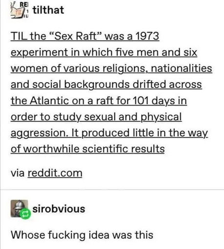 Nah, someone with something to gain has to motivate us to fight each other. What if we just said “lol, anyway” and kept getting along on the raft?