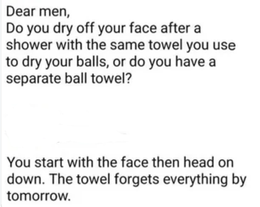 Umh…I usually take showers to get clean. So, when I´m done showering (read: when I have successfully finished the task of cleaning my whole body), I use a towel to dry my now clean body. Since my whole body is clean now, I do not distinct between single body parts, because, as previously mentioned, they are all equally clean now.