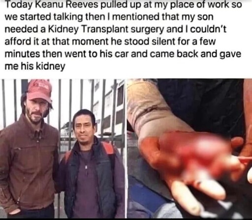 Turns out Keanu had witnessed somebody walking their dog, and that person kept jerking on the leash and kicked the dog. After rescuing the dog, the offender was tied up in Keanu’s backseat. Kidney donation is 100% justifiable consequence of his actions.