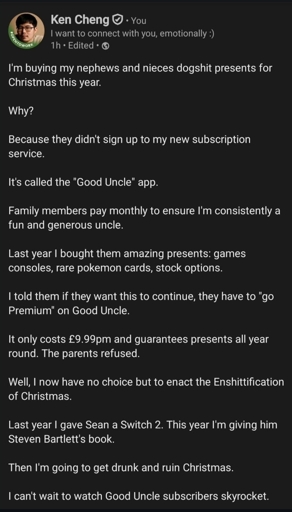 Ken Cheng is a troll LinkedIn account that regularly posts hilarious fake posts. That account is a gold mine of ridiculously funny posts 😁