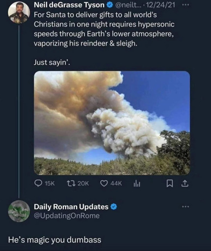 I can’t believe you’re really taking his comment seriously?! He made a post about Santa’s reindeer and sleigh vaporizing due to the speed of travel. It’s supposed to be absurd, not a science lesson.