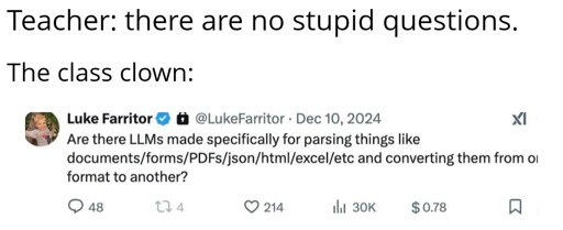 SwordInStone@lemmy.world to Programmer Humor@lemmy.ml · 11 months agoDOGE employeelemmy.worldimagemessage-square0linkfedilinkarrow-up11arrow-down10