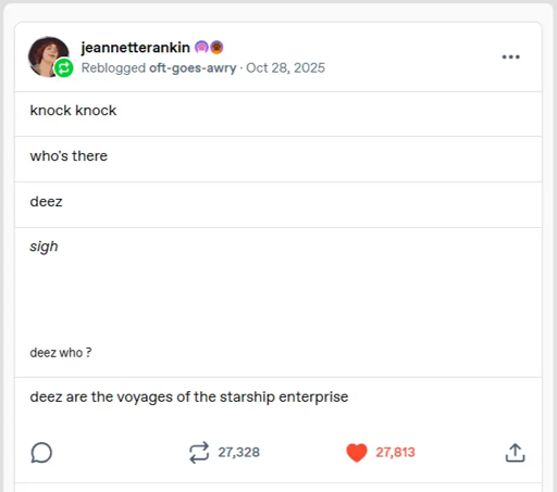 James R Kirk@startrek.websiteEnglish · 28 days agodeezstartrek.websiteimagemessage-square0linkfedilinkarrow-up1133arrow-down11