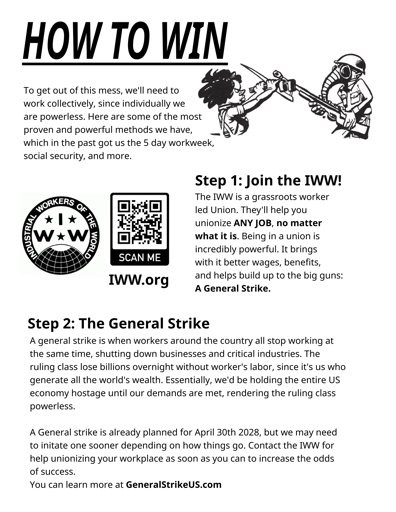 I have the general strike as step two since it made sense to explain what it is immediately after mentioning it, and how it goes hand in hand with unionizing.