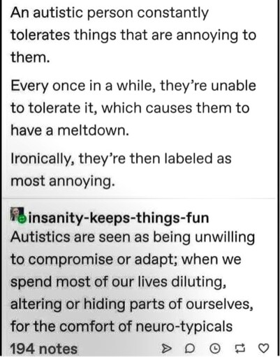 Yep, everyone has to make adaptations, compromises and has to deal with things that are not ideal. However, this is often easier for neurotypicals than it is for neurodivergent and often on a less frequent basis. As in all things both have to make adjustments and both need to understand that the others have needs. The art is in finding what works for you, what does allow you to live your life in the best quality while limiting the impact on other peoples needs. Goes for everyone neurotypical or not.