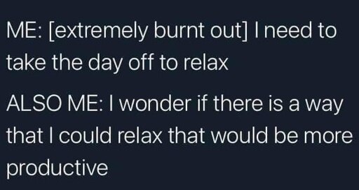 minus-squareGrool The Demon@lemmy.worldlinkfedilinkEnglisharrow-up15·5 months agoMaybe I can do some projects around the house… (two weeks later after building new furniture and reorganizing everything) Jesus, I’m exhausted… maybe I should paint.