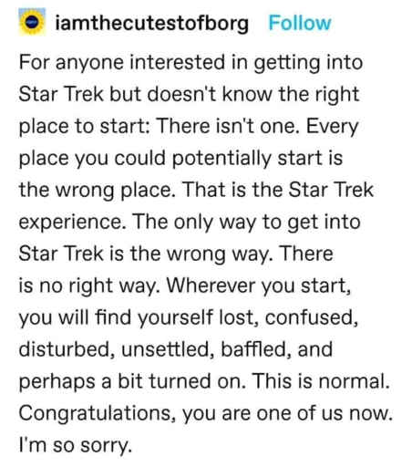 I have never watched a single star trek thing and the only knowledge I have about it comes from you guy’s memes