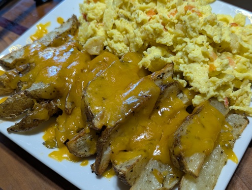 It’s what was on hand. Wife craving eggs and TBH we have too many eggs right now anyway so some needed using up. I need to clear out some of this smoked cheese so I can be ready to make more when it gets colder. And I had two pounds of potatoes that were getting close to gone and needed used up.