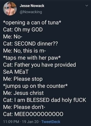 My roommate does this with their cat. Now whenever anyone operates a can opener the cat comes running and MEOWS, even though in my case it’s never tuna.