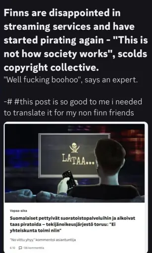 lanigerous@feddit.uk to Piracy: ꜱᴀɪʟ ᴛʜᴇ ʜɪɢʜ ꜱᴇᴀꜱ@lemmy.dbzer0.comEnglish · edit-24 months agoGood old Finland (subtitle is commentary, not in text)lemmy.blahaj.zoneimagemessage-square34linkfedilinkarrow-up1492arrow-down16file-textcross-posted to: onehundredninetysix@lemmy.blahaj.zone