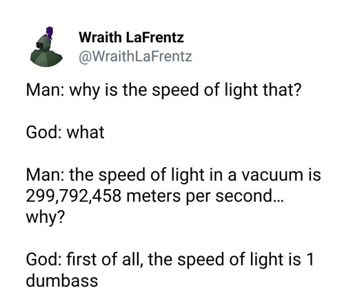 Man: the speed of light in a vacuum is 299,792,458 meters per second… why?