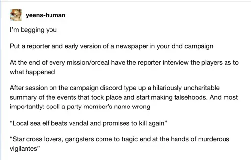 definitely pitching this to my DM for the upcoming Eberron campaign; we’ve been watching Legend of Korra for vibes and inspiration, and the recaps in that show were perfectly fit for the setting
