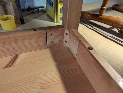 The legs have a hollow center drilled out, at the top, so I assume some metal piece with threaded holes fit there, and a metal plate anchored that to the skirt (?).