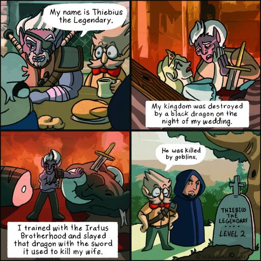 I believe Brian Murphy said you can write that backstory for a D&D character and make it work if it’s a comedy and all of that greatness is just in your character’s head. I don’t get to play much but tried to take a similar mindset: my character isn’t as badass as they think they are.