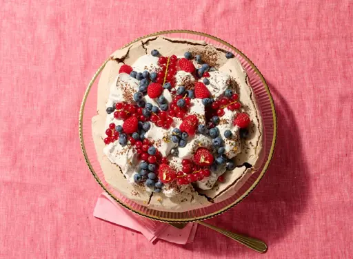 Carefully remove the meringue from the baking paper and place it carefully on a cake stand. Spread the cream over it, followed by the fruit mix, redcurrants, and the remaining chocolate. Sprinkle with the gold leaf. Serve immediately.