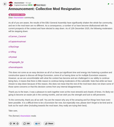 geneva_convenience@lemmy.ml to Reddit@lemmy.world · 2 months agoMultiple r/eurovision mods resign as protest against Israeli participation in the contest.lemmy.mlimagemessage-square8linkfedilinkarrow-up1131arrow-down11file-text