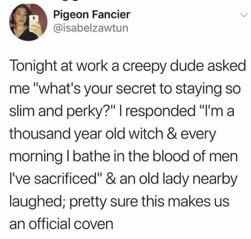 I had a customer tell me once that he could always recognize me from behind because I’m so skinny. I didn’t have a comeback, because what the fuck, but I told him that was something I didn’t want to hear from him and then he got all offended. He told me it was rude, so I told him next time he could recognize which barista was rude.