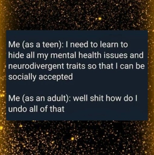 minus-squarejahtnamas [sie/hir]@slrpnk.netlinkfedilinkEnglisharrow-up4·3 months agomore like i was forced to hide all my mental issues by my abusive mother so i could adhere to her (extremely high) standards of social acceptance