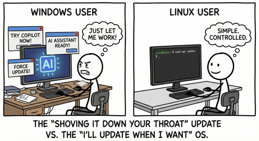 The template „AI vs no need to update” generally has nothing to do with each other, and is generally just the stuff regurgitated by just about every YouTube channel by now; unlike most Linux users memes, which ranges generally in more niche topics