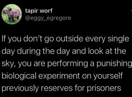 minus-squarebitwolf@sh.itjust.workslinkfedilinkEnglisharrow-up3·2 months agoMaybe if theyre open? I read you get Vitamin D from the sun light hitting your retinas and hair in addition to your skin. But there is also benefits from look far away at the horizon youd need to find a way to replicate that from a window.