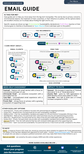 There is also a community-driven, open-source site ( https://purchasewithpurpose.io/category/email/ ) that aims to make this even easier. This includes screenshots, ratings and a larger feature list.