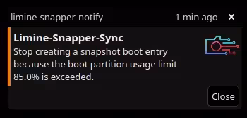 Stop creating a snapshot boot entry because the boot partition usage limit 85.0% is exceeded.