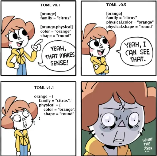 toml. I’ve never liked that the properties of some thing can be defined all over the place, and I’ve definitely never liked that it’s so hard to read nested properties.JSONis my friend.They serve largely different use-cases. JSON is good for serializing data. TOML is good for configuration.