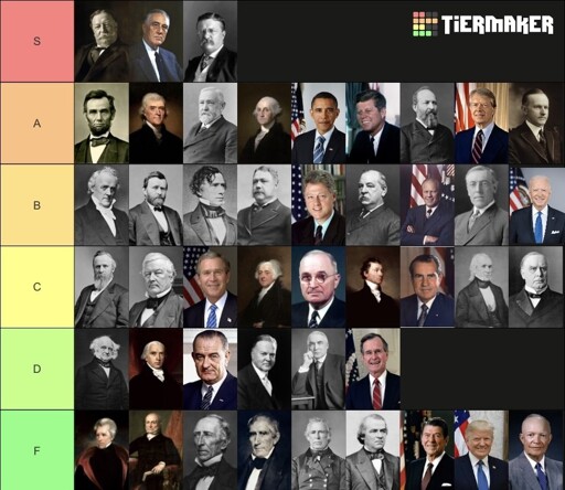 Is that Taft in the S tier? And Teddy Roosevelt? Funny considering they had a falling out in 1912(?). Taft set a high bar for President. Probably the 2nd best President of the 20th century (FDR being the 1st). Back when the US had decent politicians.